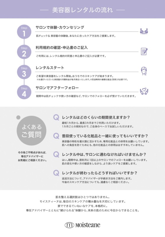 初期費用は不要、化粧品とレンタル代でスタート!肌との相性や、サロンに通う、日々のお手入れが習慣になっていく感覚を体験できます。